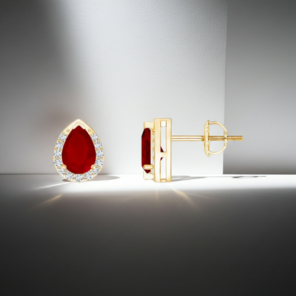 These exquisite earrings are a true testament to timeless beauty and luxurious craftsmanship. Crafted from 14K solid gold, they feature a stunning pear-shaped ruby, meticulously cut to showcase its fiery brilliance. Enhancing the ruby's allure is a delicate halo of shimmering diamonds, creating a breathtaking display of sparkle and sophistication. The diamonds are expertly set to complement the ruby's deep red hue, adding a touch of celestial radiance to these earrings.
