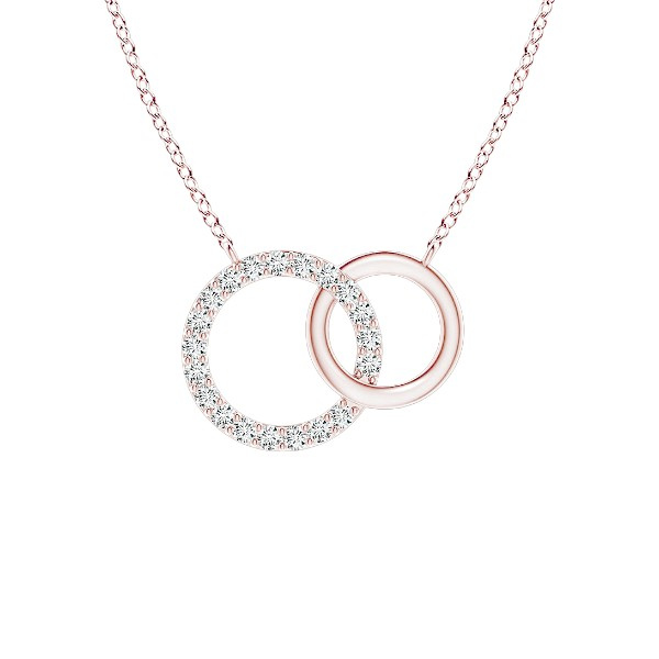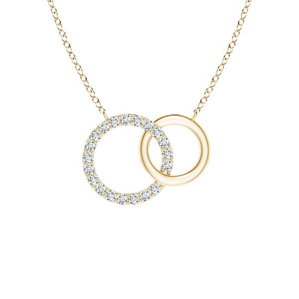 This elegant 14K solid gold two circle diamond necklace is the perfect addition to any jewelry collection. This necklace is crafted from 14K solid gold and features two circles of diamonds that shimmer and sparkle in the light. The two circles are connected by a delicate chain, making this necklace a timeless piece that can be worn for any occasion.