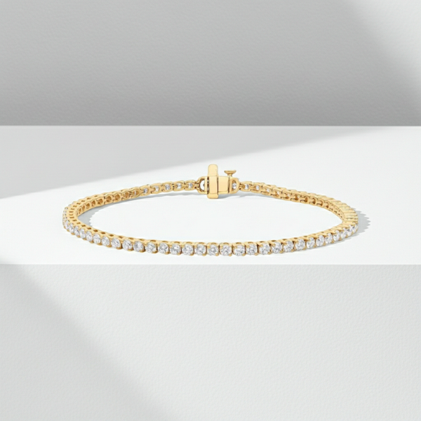Elevate your elegance with our exquisite 14K solid gold tennis bracelet. Featuring meticulously prong-set diamonds measuring 2.00 MM, this sophisticated piece offers brilliant sparkle between 2.00 and 2.60 carats total weight. The classic design ensures timeless appeal while the secure setting guarantees lasting luxury for discerning connoisseurs of fine jewelry.