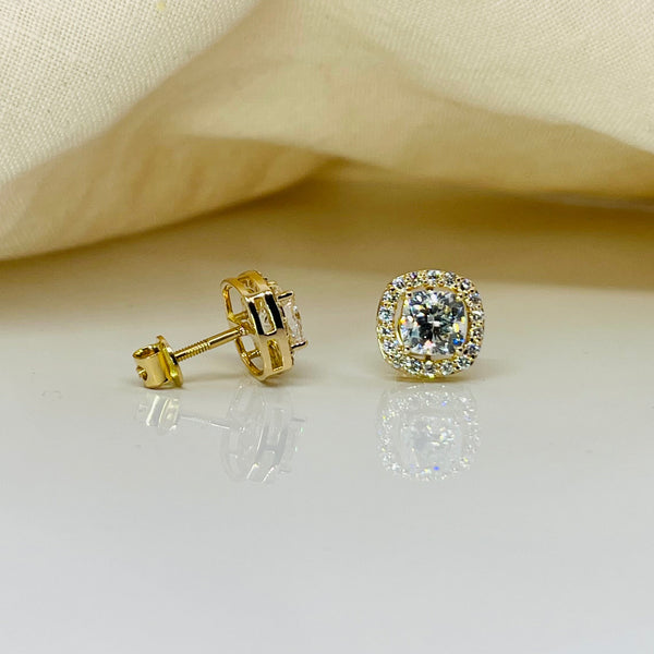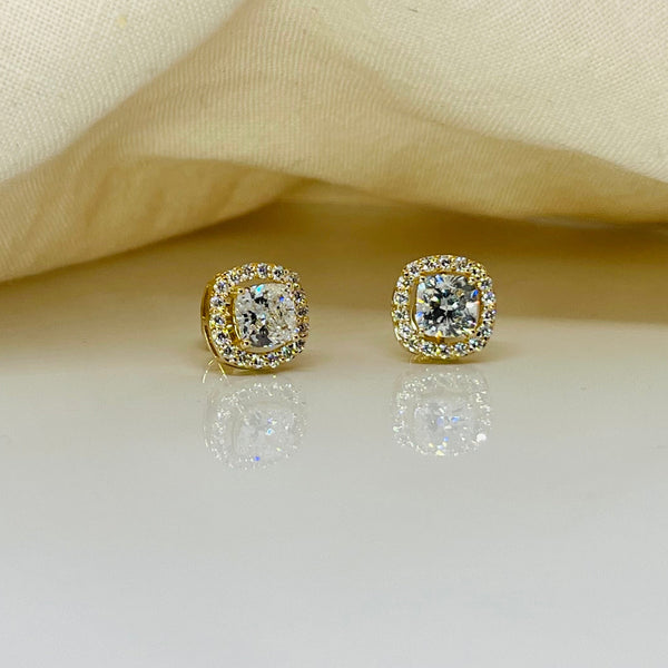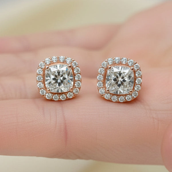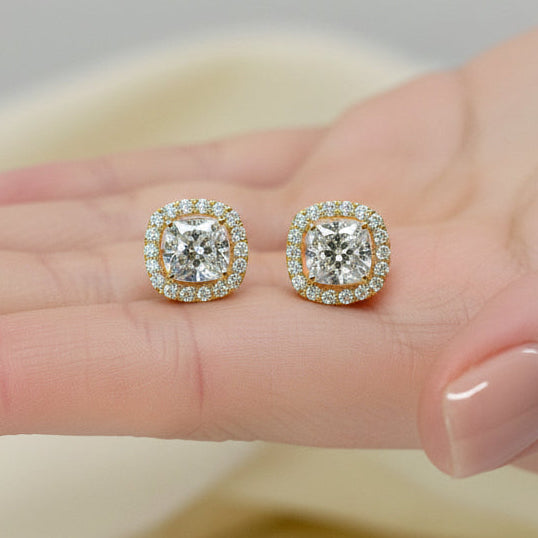 Embodying the quintessence of elegance, this Cushion Cut Halo Diamond Earrings Set, meticulously crafted in 14K solid gold, envelops the wearer in an aura of timeless sophistication. The resplendent cushion cut diamonds, framed by a halo of scintillating brilliance, evoke the artistry of celestial jewels, making this exquisite adornment an essential statement of refined luxury.