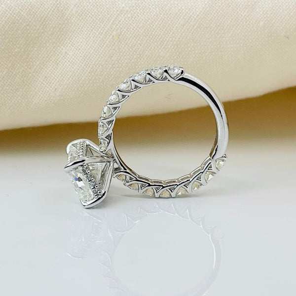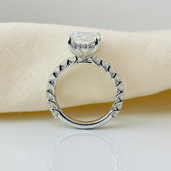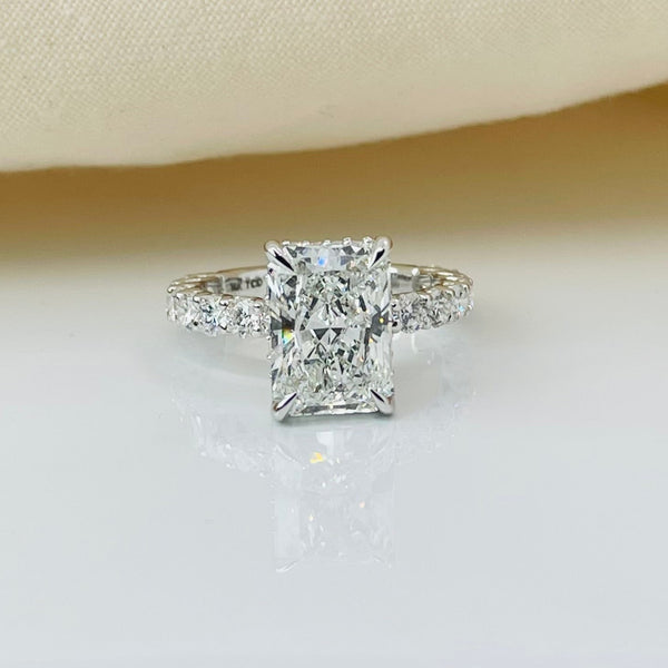 Elevate your engagement with this sophisticated radiant cut ring, featuring a stunning 3 to 5 carat center stone set in lustrous 14K solid gold. The curved side band design creates an elegant flow that complements the radiant's brilliant faceting, enhancing sparkle and light performance. Crafted for durability and timeless appeal, this piece balances contemporary styling with classic elegance—ideal for those seeking a distinctive yet refined symbol of commitment.