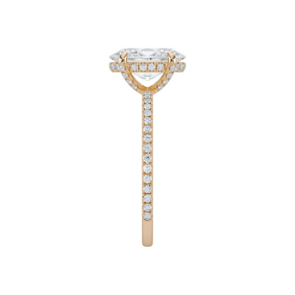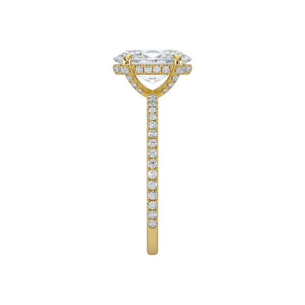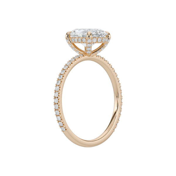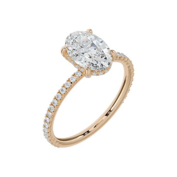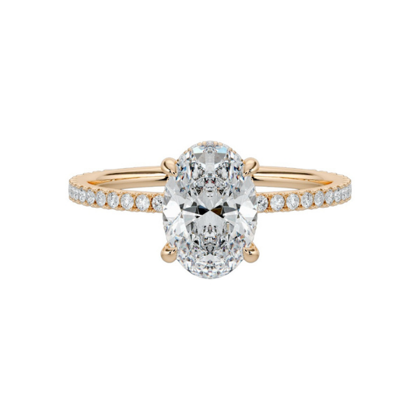 Elevate your engagement with this sophisticated 14K solid gold ring, featuring an elegant oval-cut center stone framed by a hidden halo of accent diamonds. The concealed halo design maximizes the prominence of your main stone while adding subtle sparkle and structural support. Complementing prong-set diamonds along the band create a refined, continuous shimmer. Crafted from durable 14K gold, this piece combines timeless elegance with modern design sensibilities, offering a distinctive alternative to traditional solitaire settings. Perfect for those seeking understated luxury with exceptional brilliance.